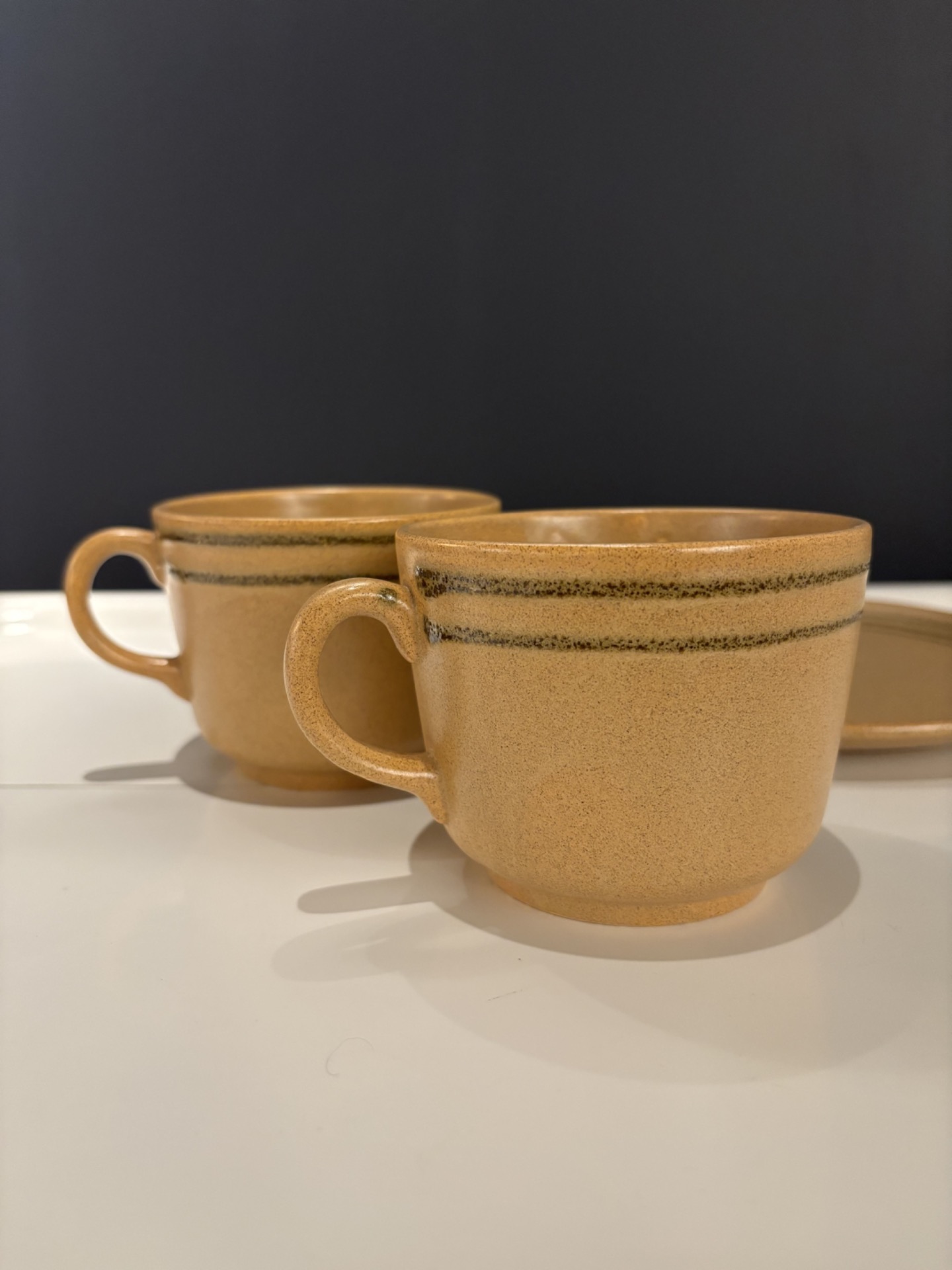 Ensemble de deux grandes tasses en grès à la teinte beige chaude, soulignée par un liseré brun discret.