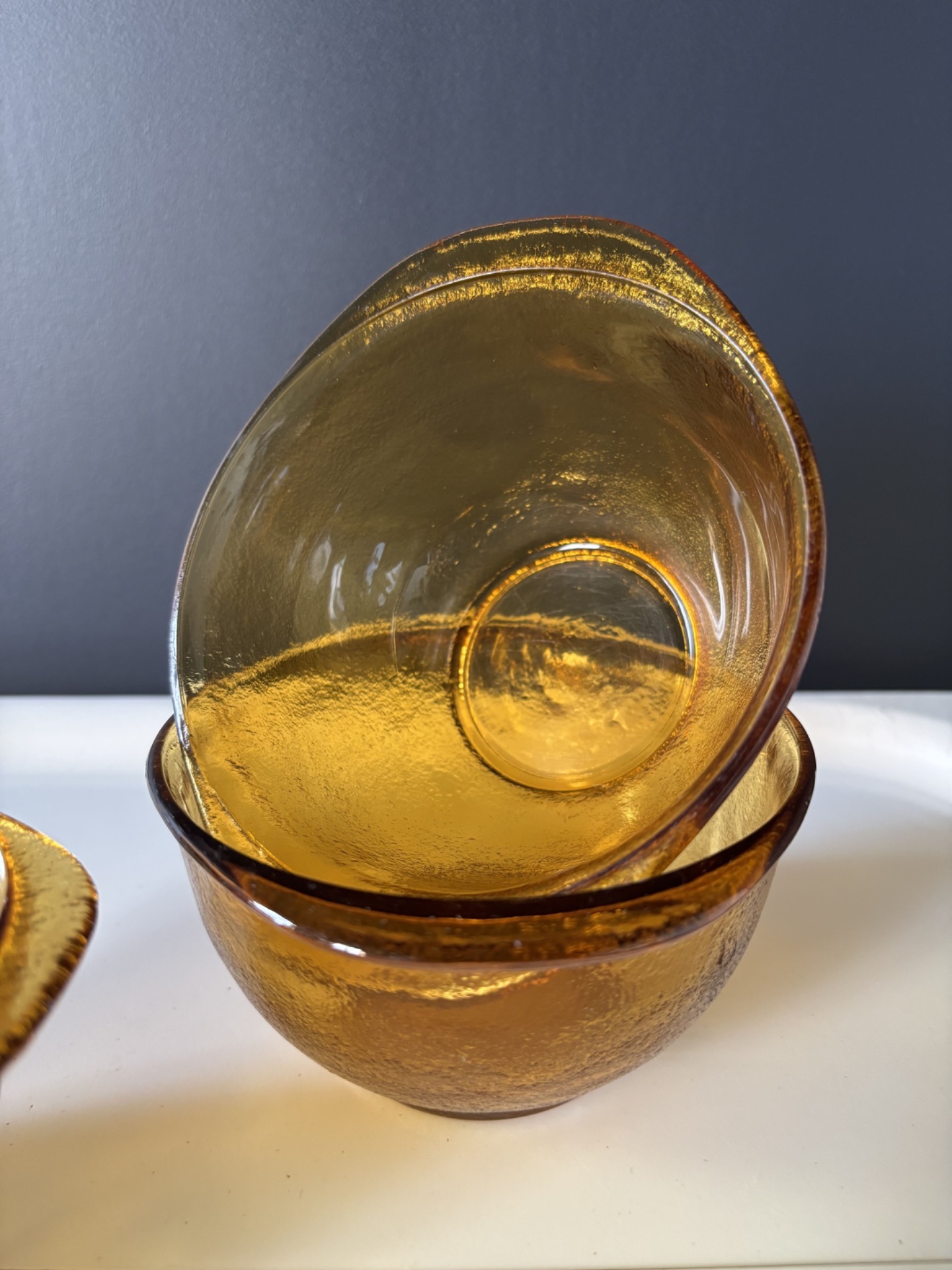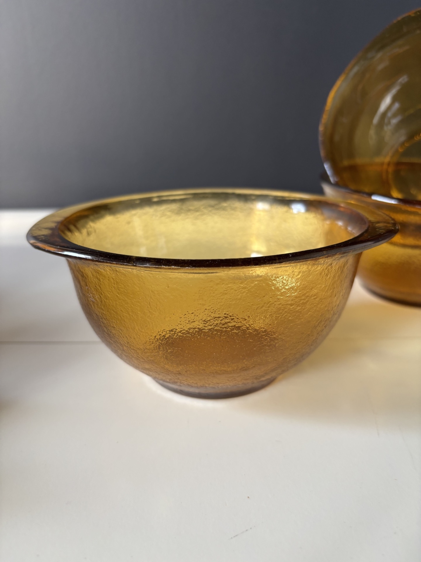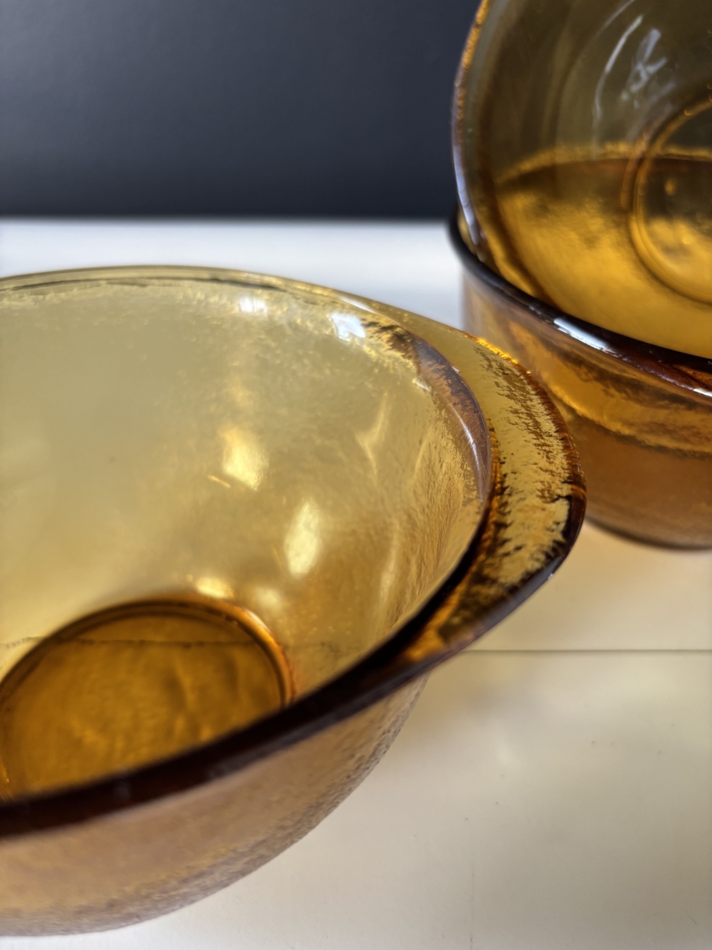 Set de 3 bols vintage en verre ambré, au design intemporel et à la texture légèrement martelée.