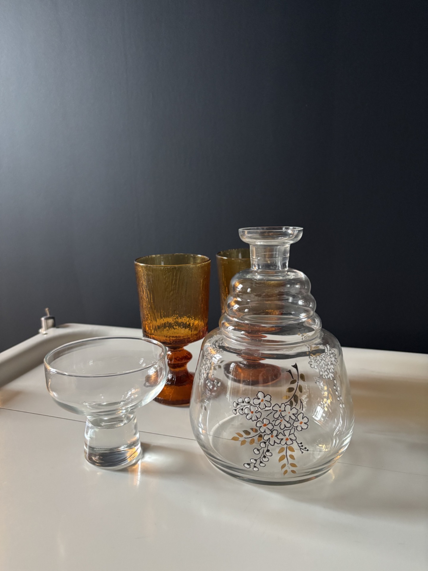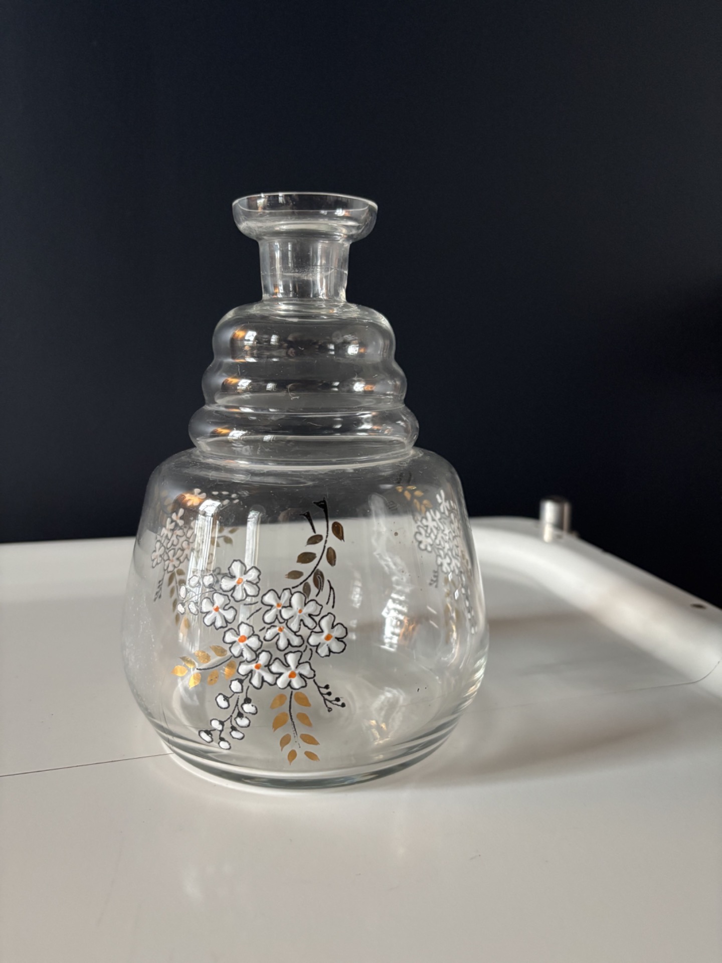 Carafe vintage en verre transparent décorée d'un motif floral délicat blanc et doré.