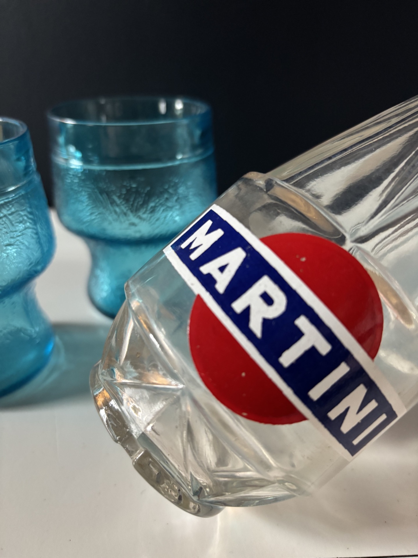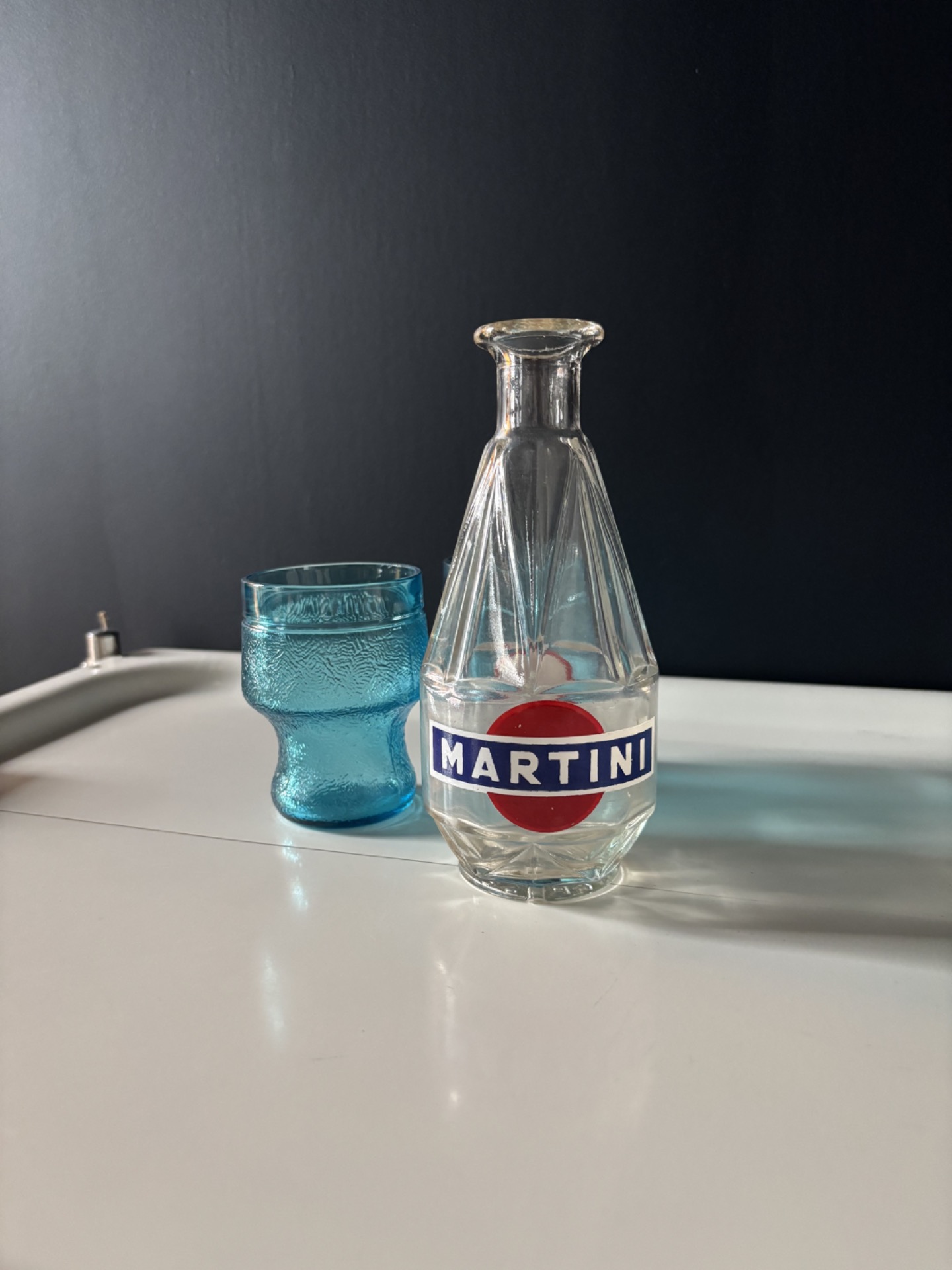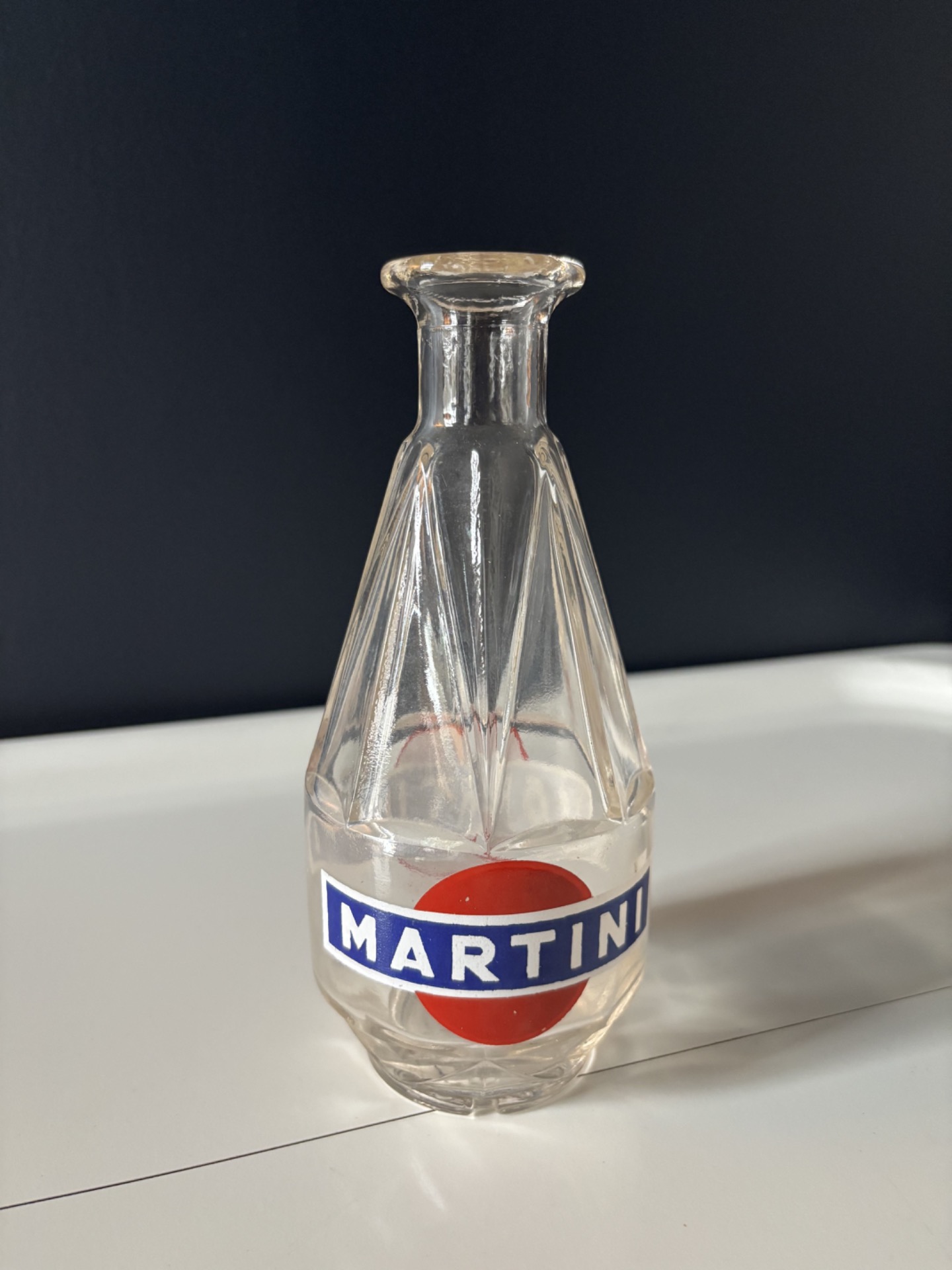 Carafe vintage en verre transparent décorée du célèbre logo Martini rouge et bleu.