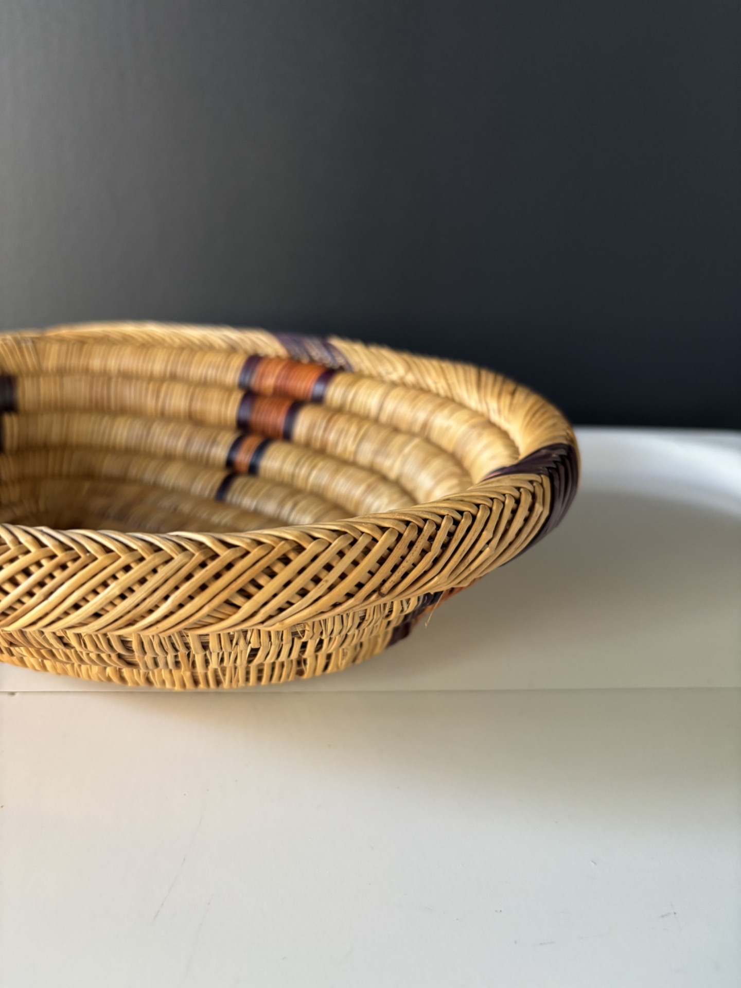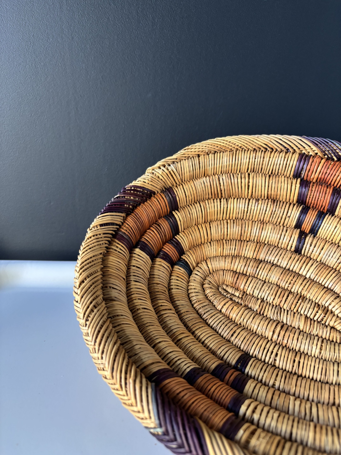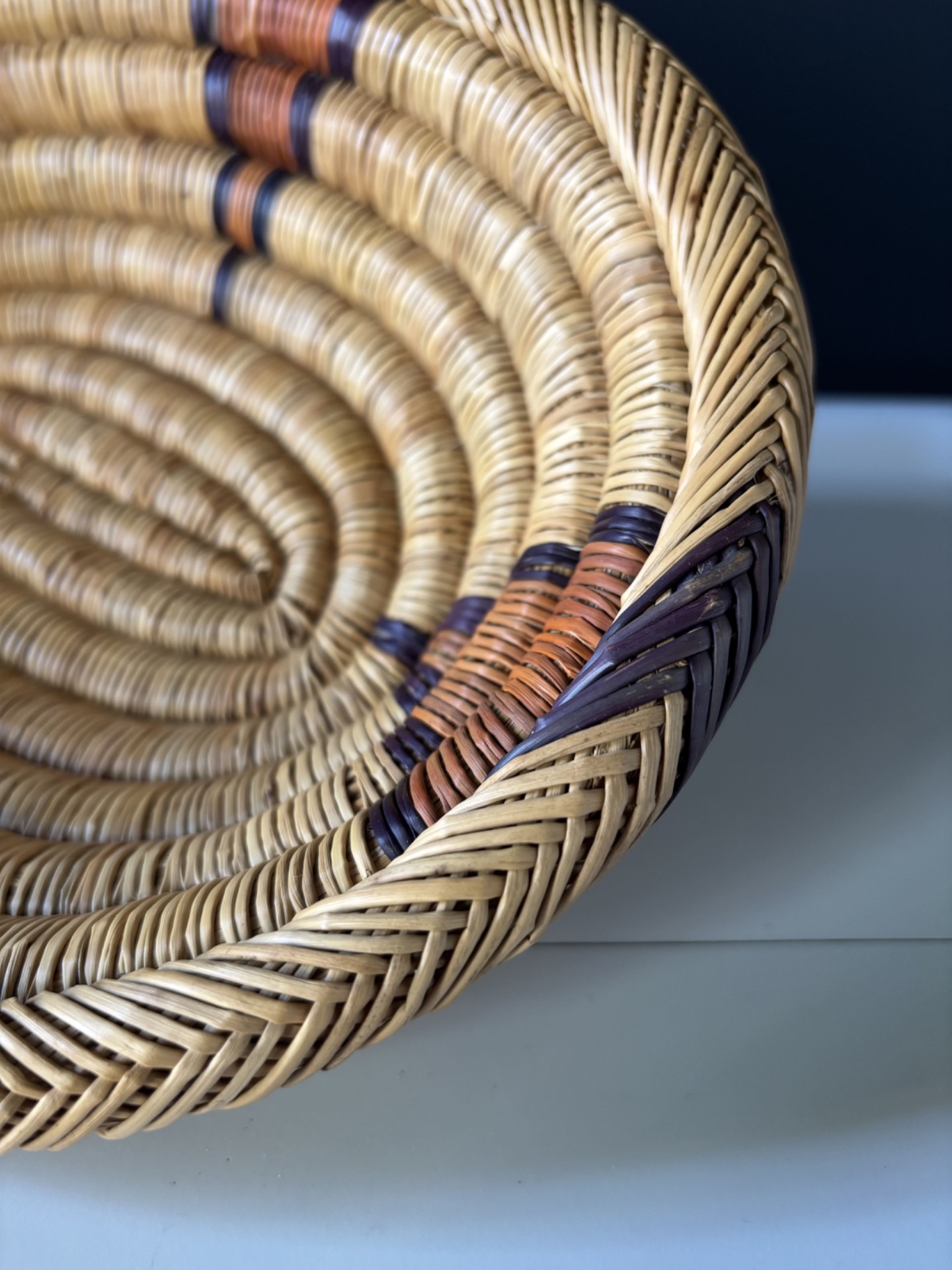 Corbeille en fibres naturelles tressées, au motif spiralé souligné de touches brunes, noires et ocre.