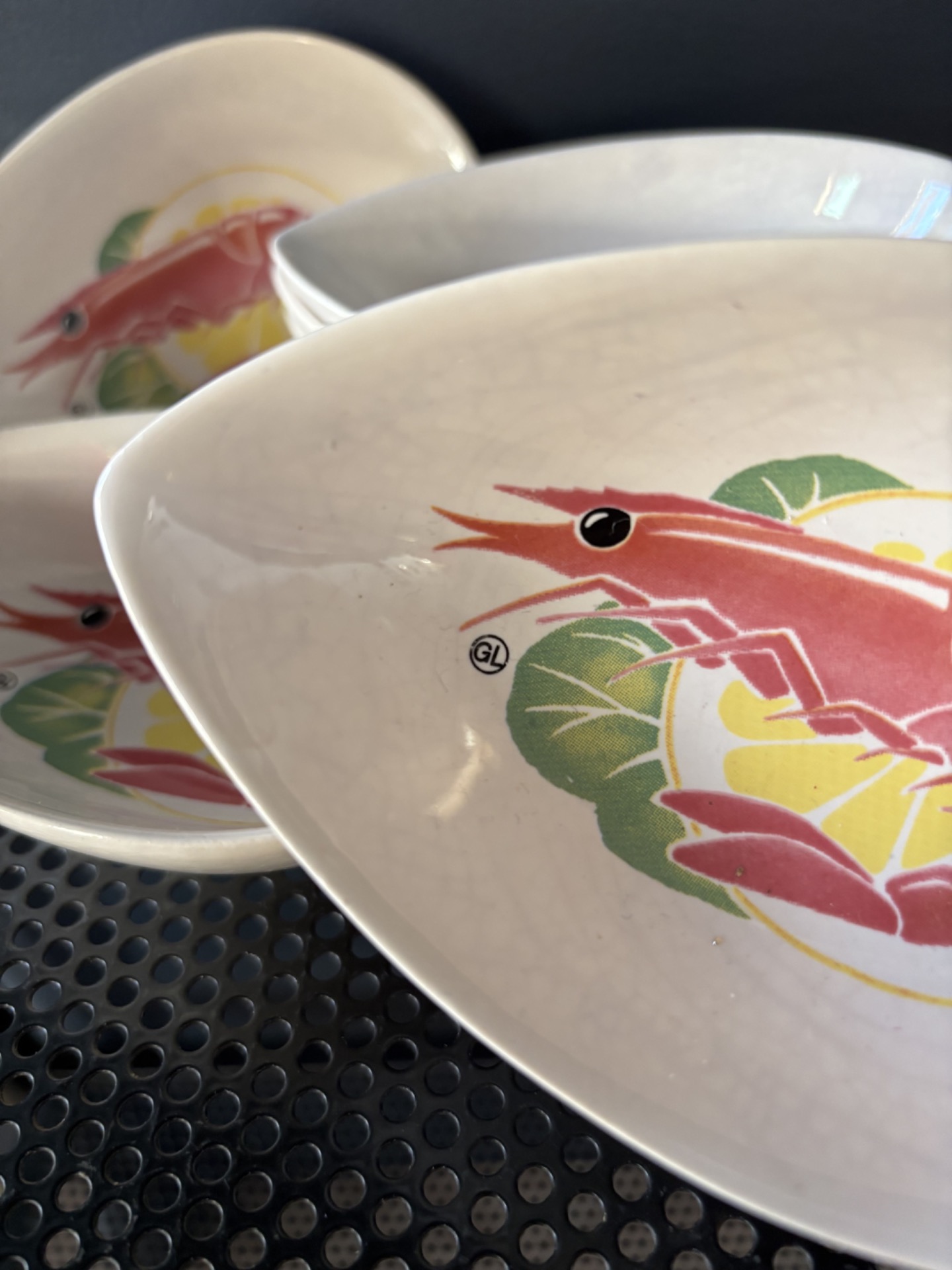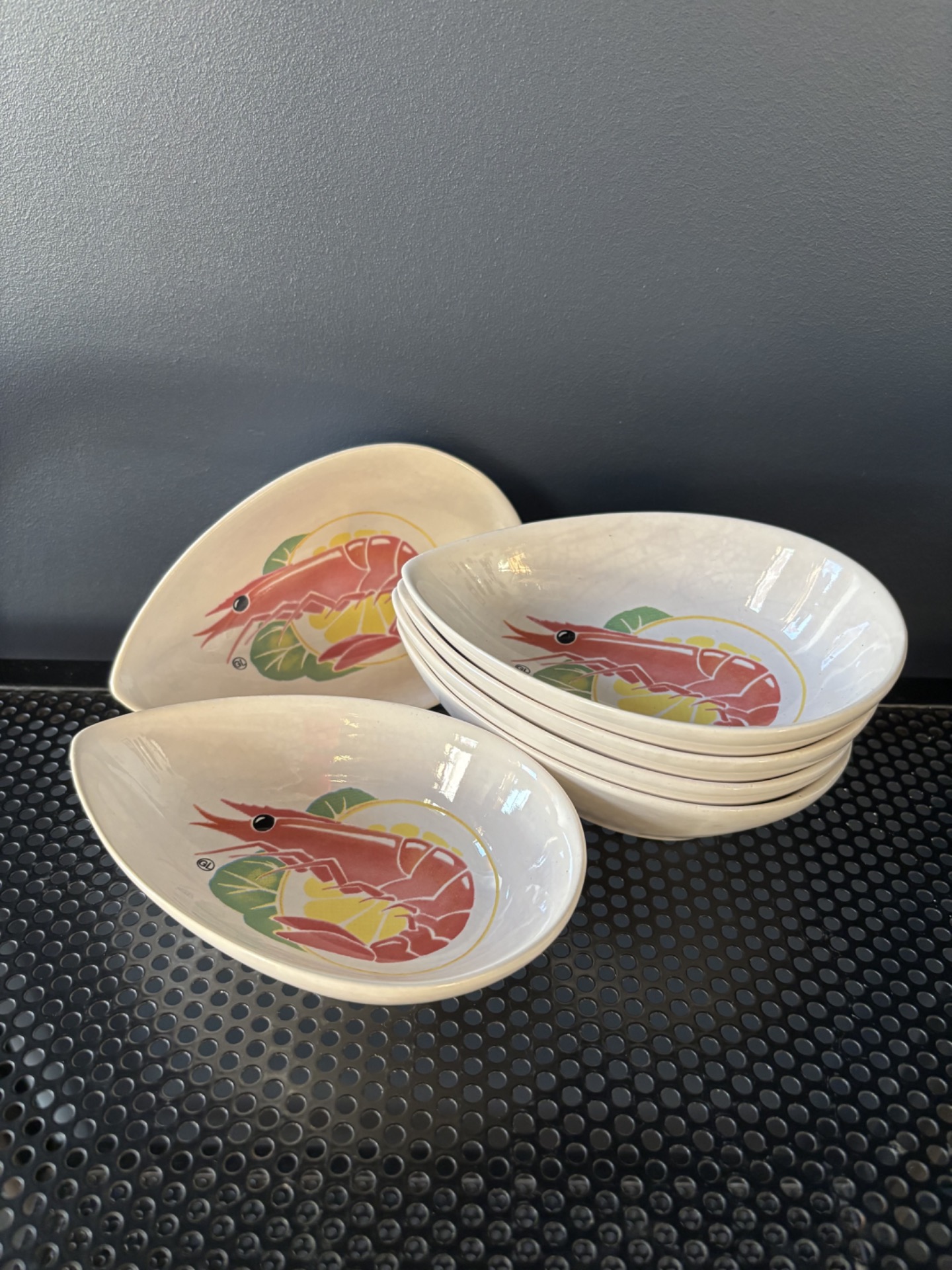 Lot de 6 coupelles en céramique à décor central représentant une crevette rose stylisée sur fond jaune et vert.