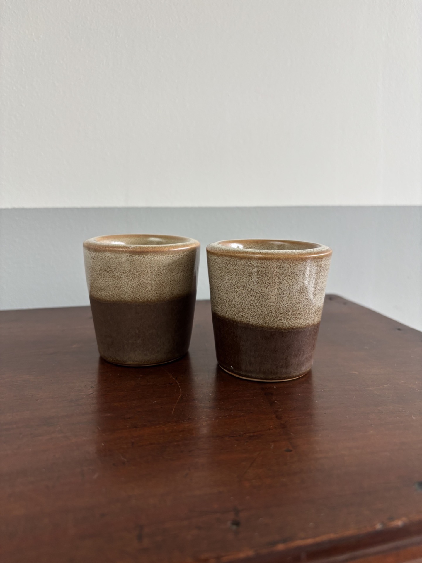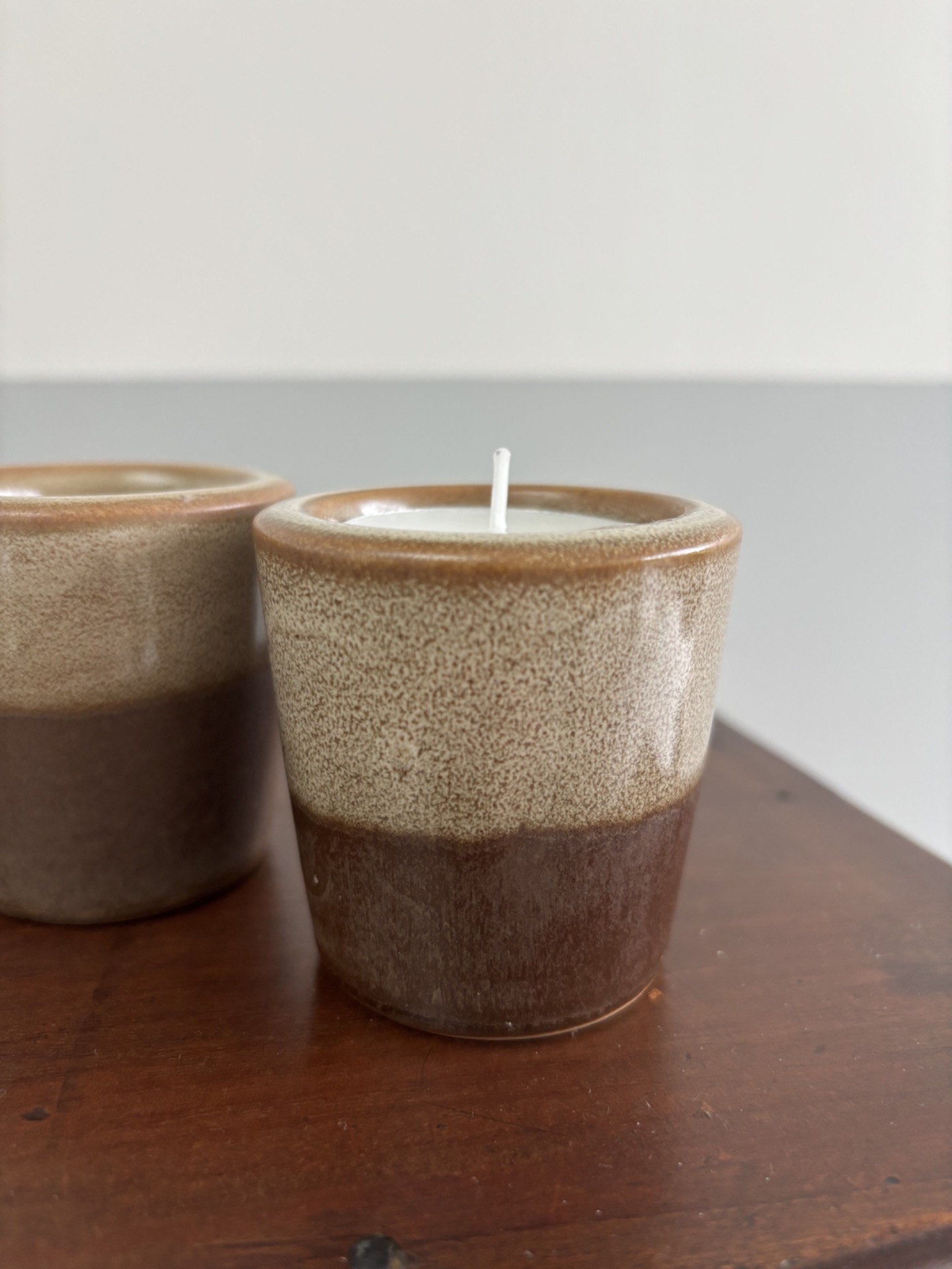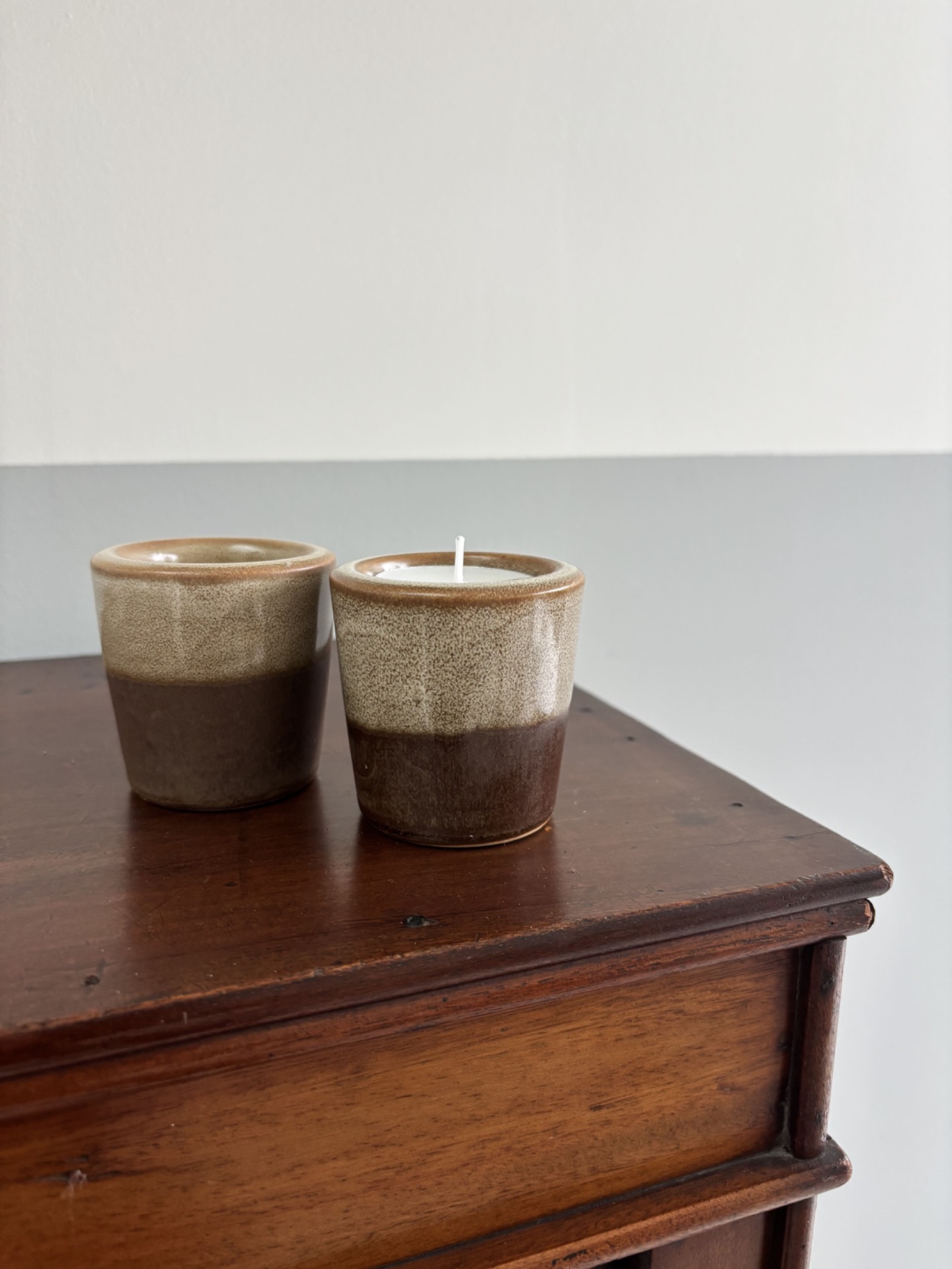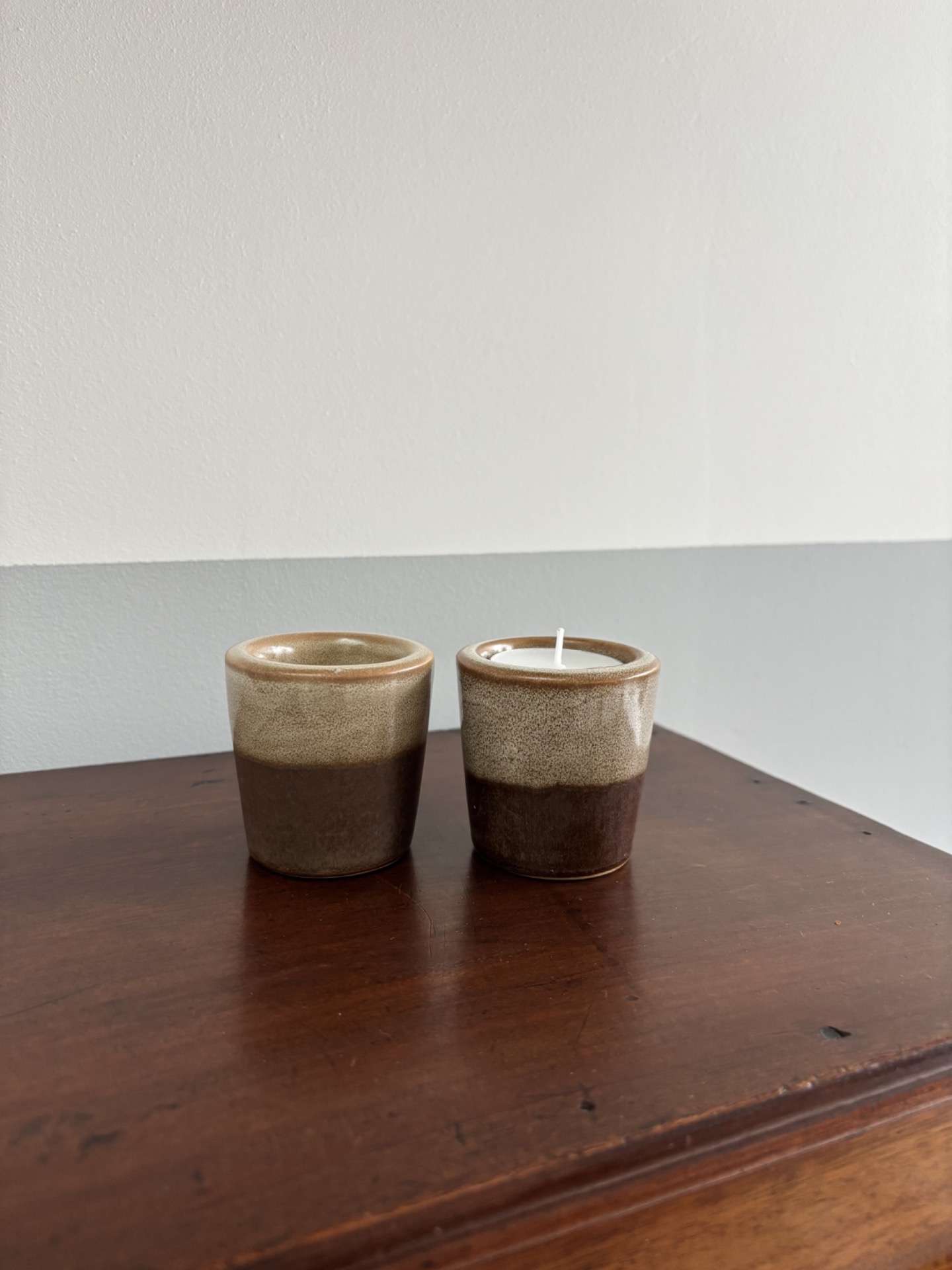 Duo de photophores vintage en grès, aux teintes brunes et beige moucheté, typiques des céramiques des années 70.