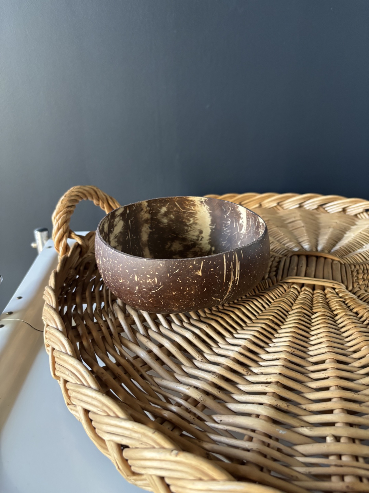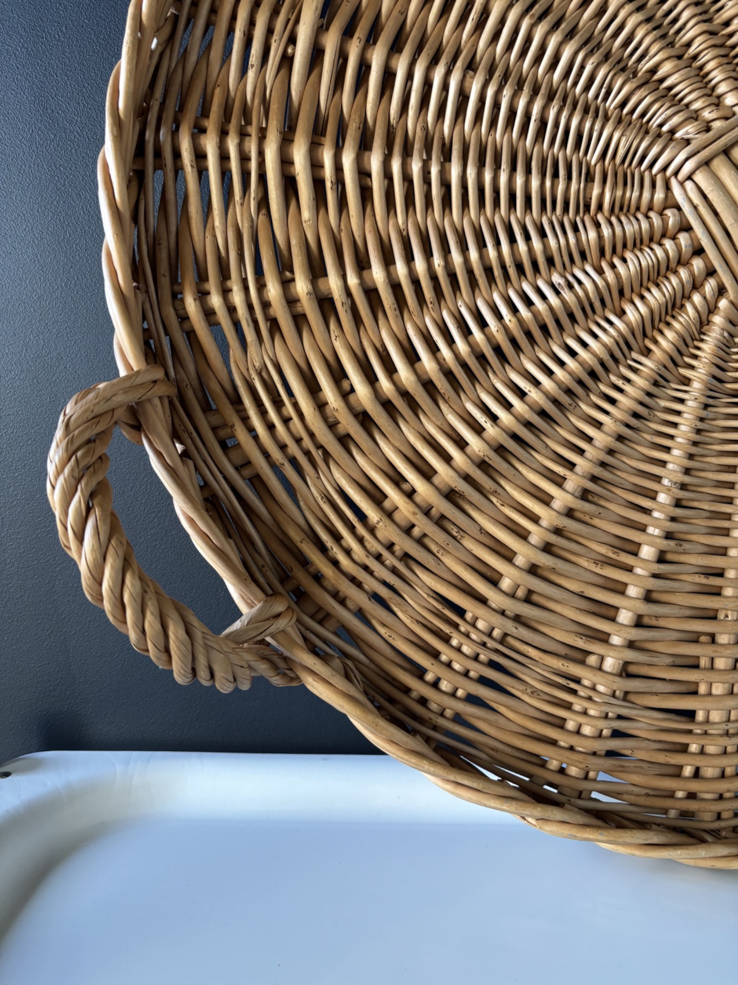 Grand plateau vintage en rotin tressé.