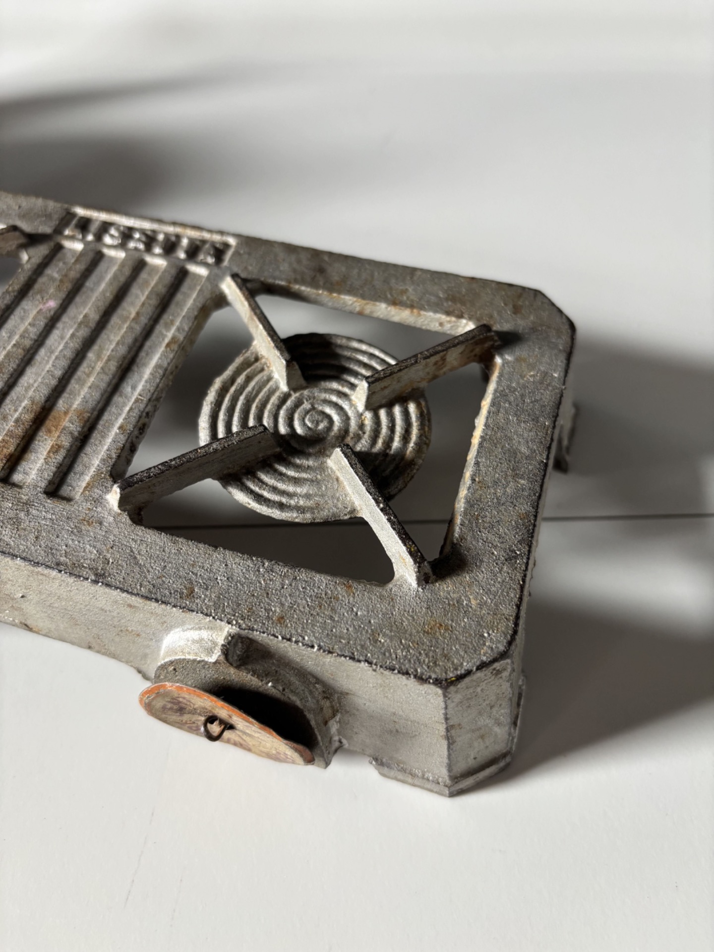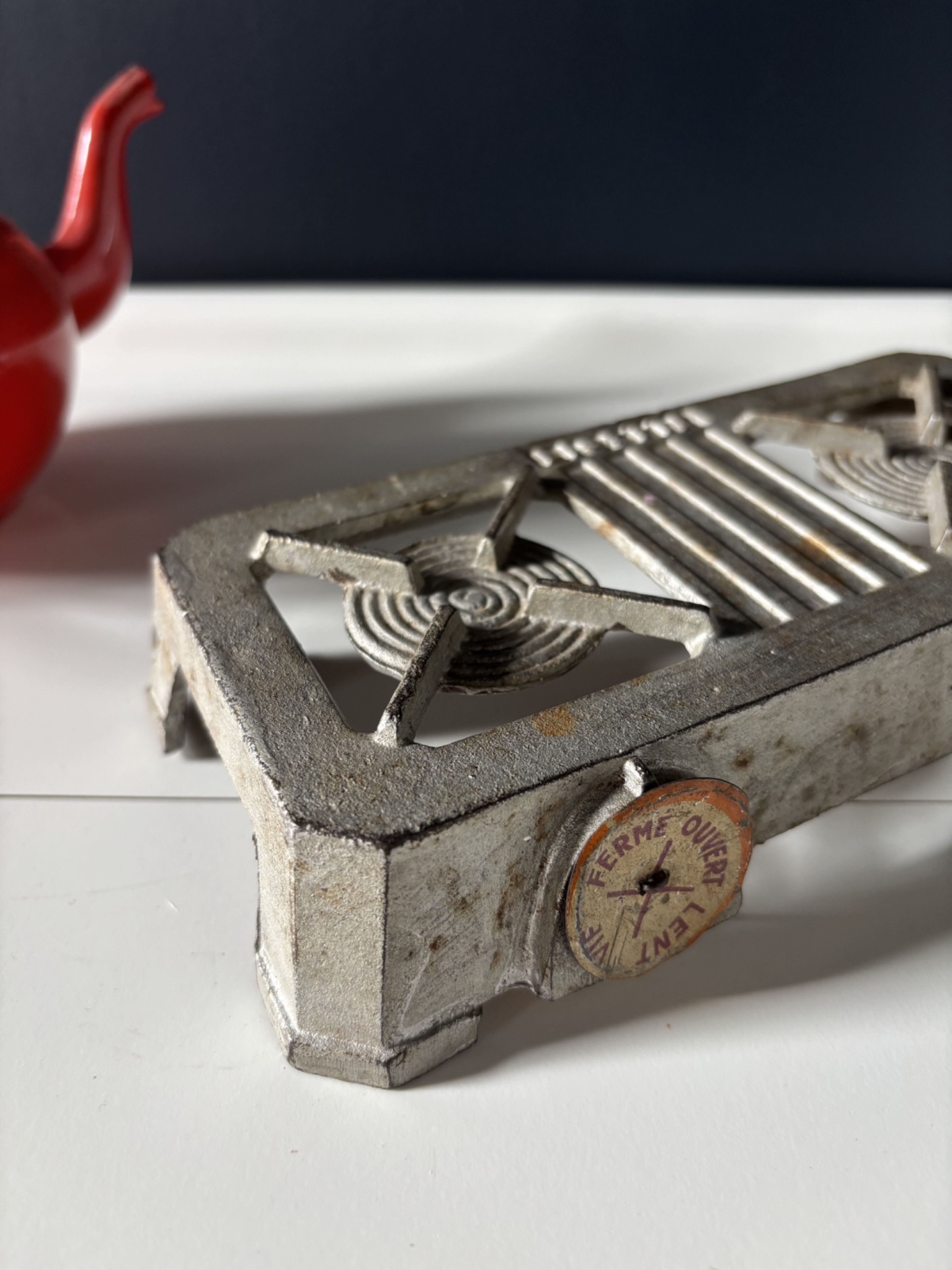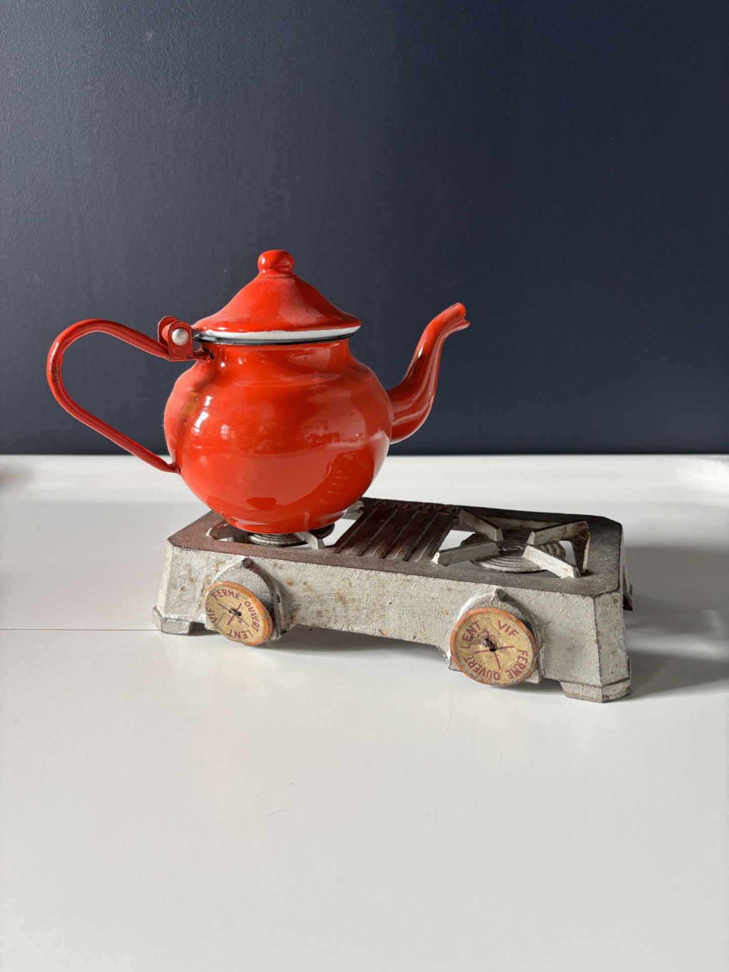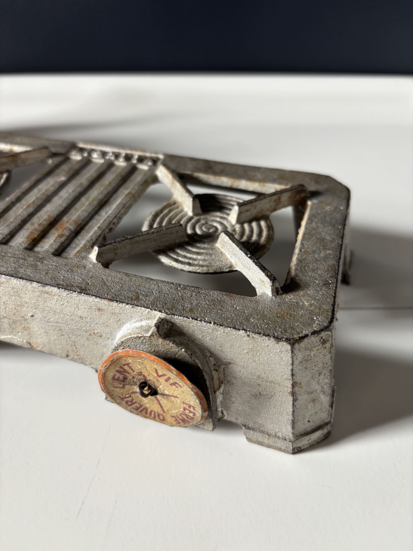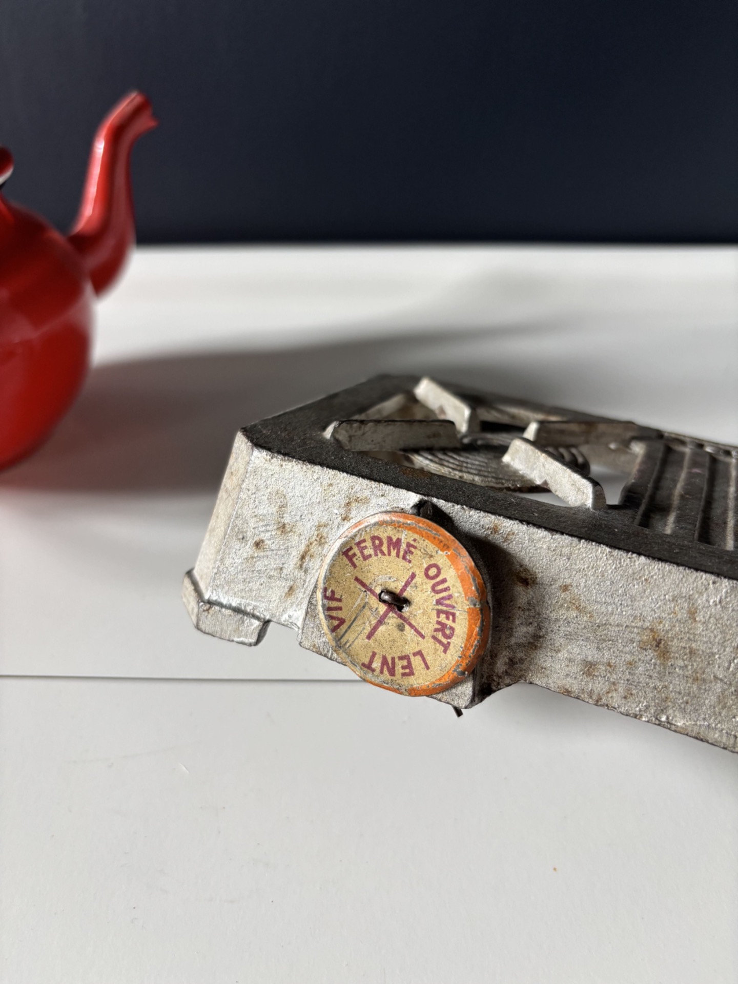 Dotée de deux feux moulés, de boutons de réglage ornés d'étiquettes d'origine et d'une patine naturelle, cette petite gazinière était autrefois un jouet emblématique des enfants. Aujourd'hui, elle devient une pièce de collection recherchée ou un objet décoratif unique.