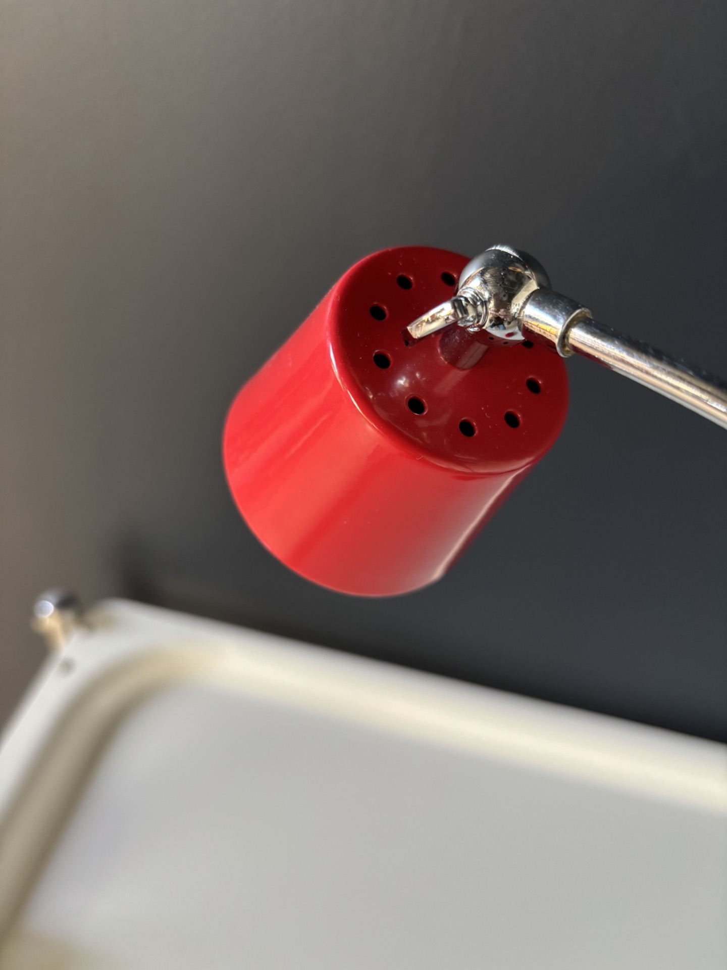 Lampe vintage au design minimaliste avec base et abat-jour rouges associés à un bras en métal chromé courbé.