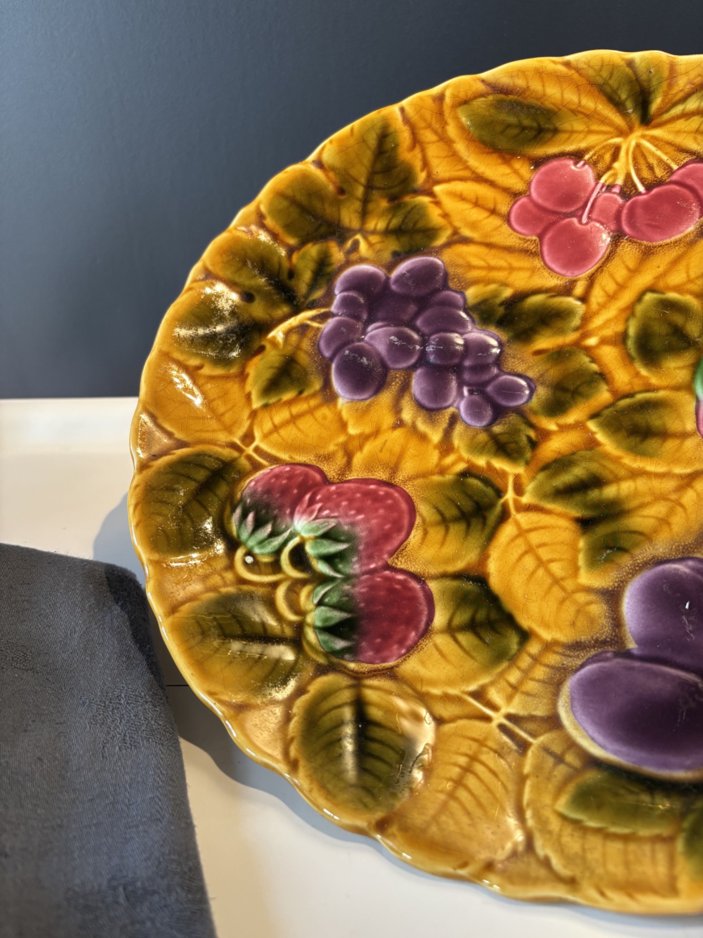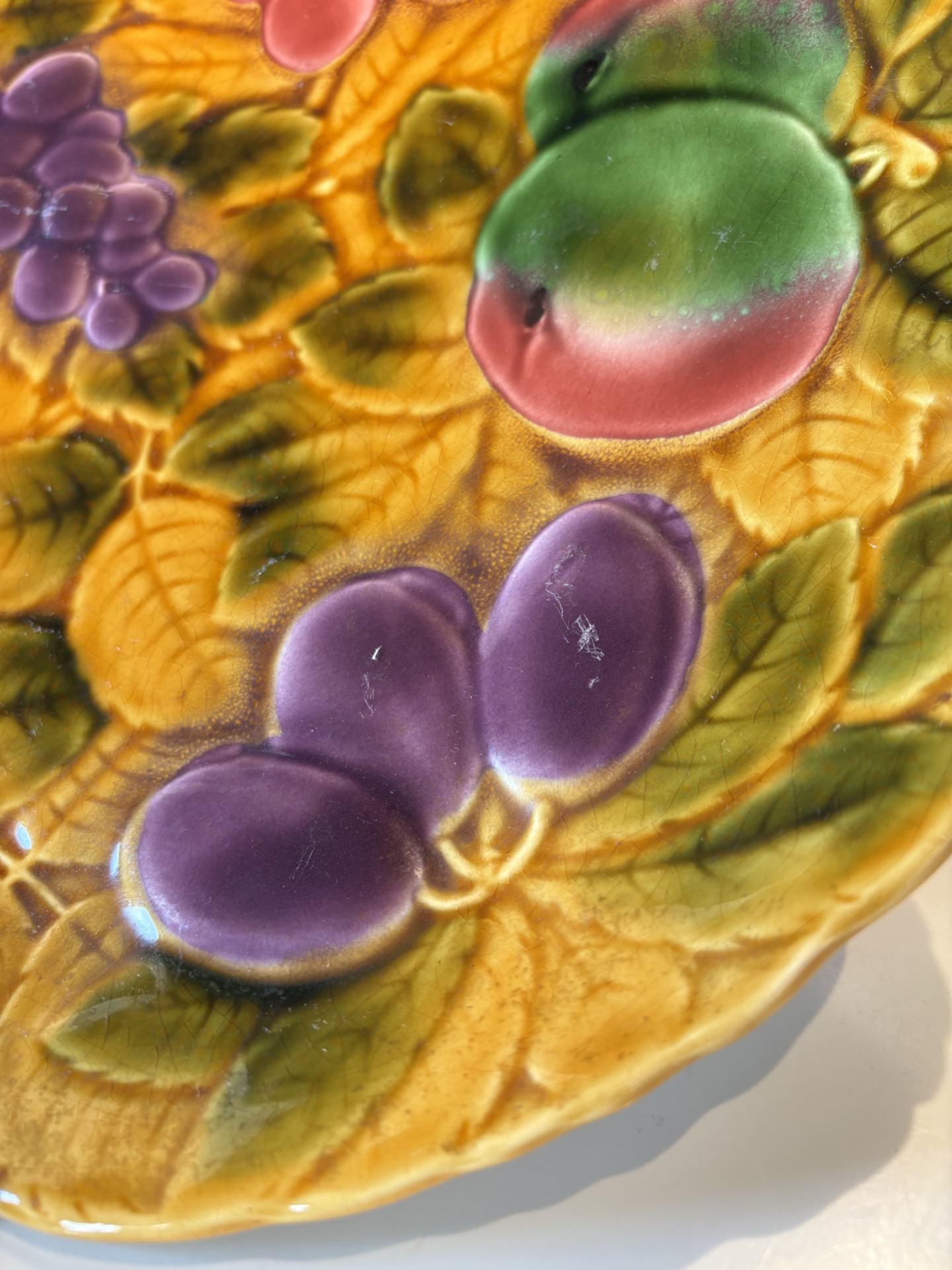 Plat de service en barbotine de Sarreguemines, réalisé en faïence vernissée à décor de fruits et feuillage en relief.