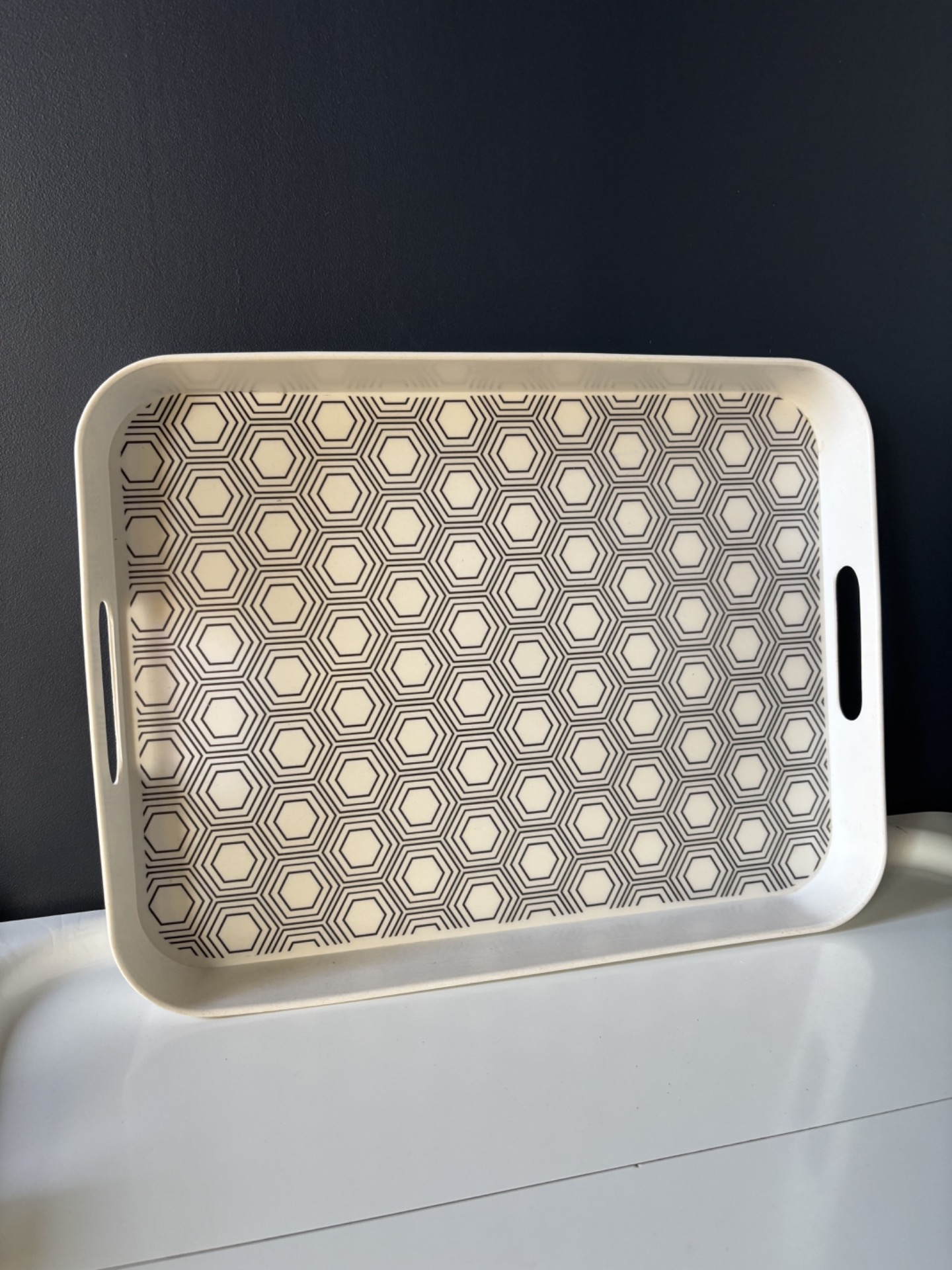 Plateau au motif géométrique noir et blanc, au design minimaliste et résolument moderne.