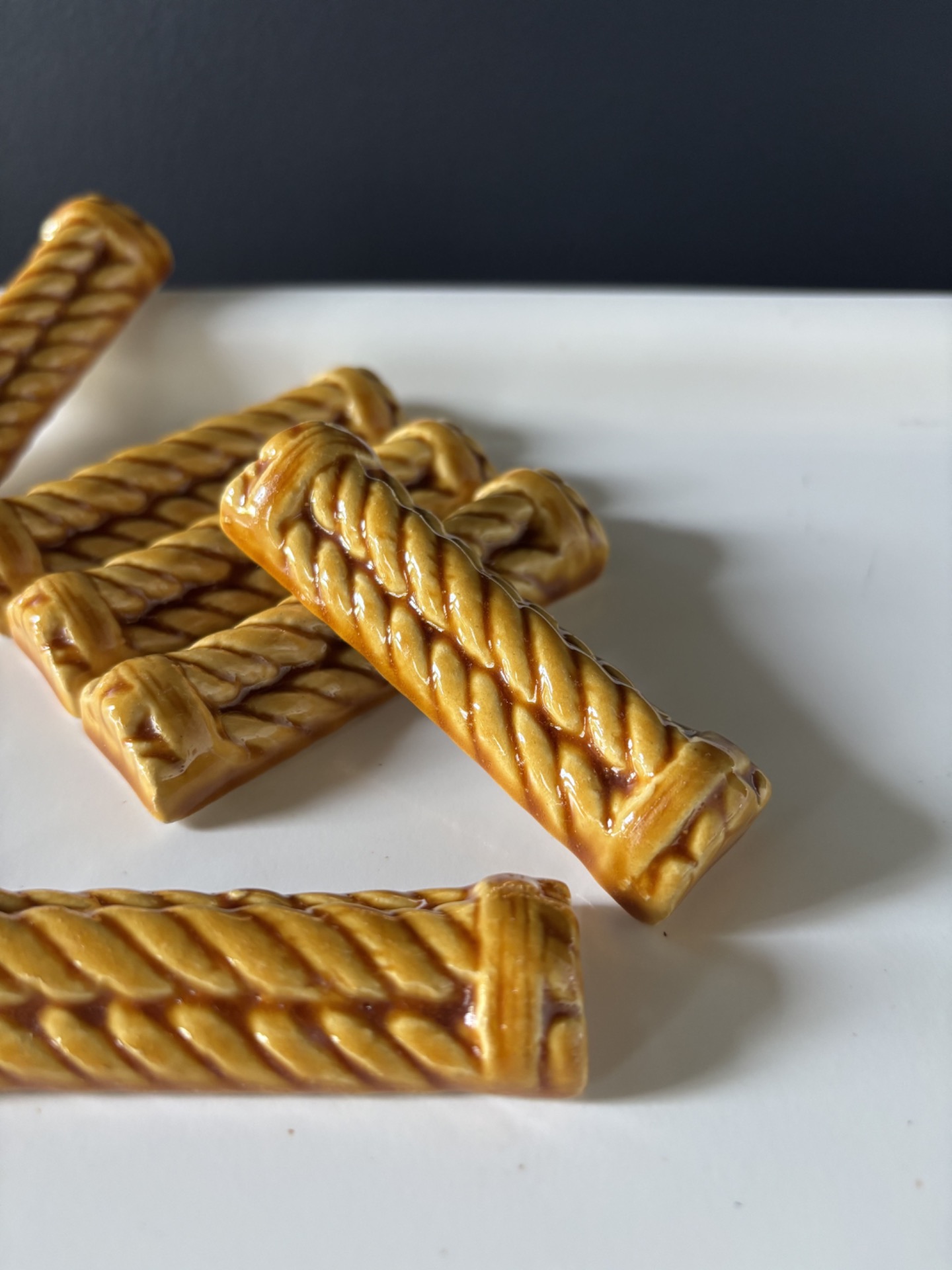 Ces porte-couteaux en céramique séduisent par leur finition brun caramel brillante et leur motif tressé en relief, typique des pièces vintage.