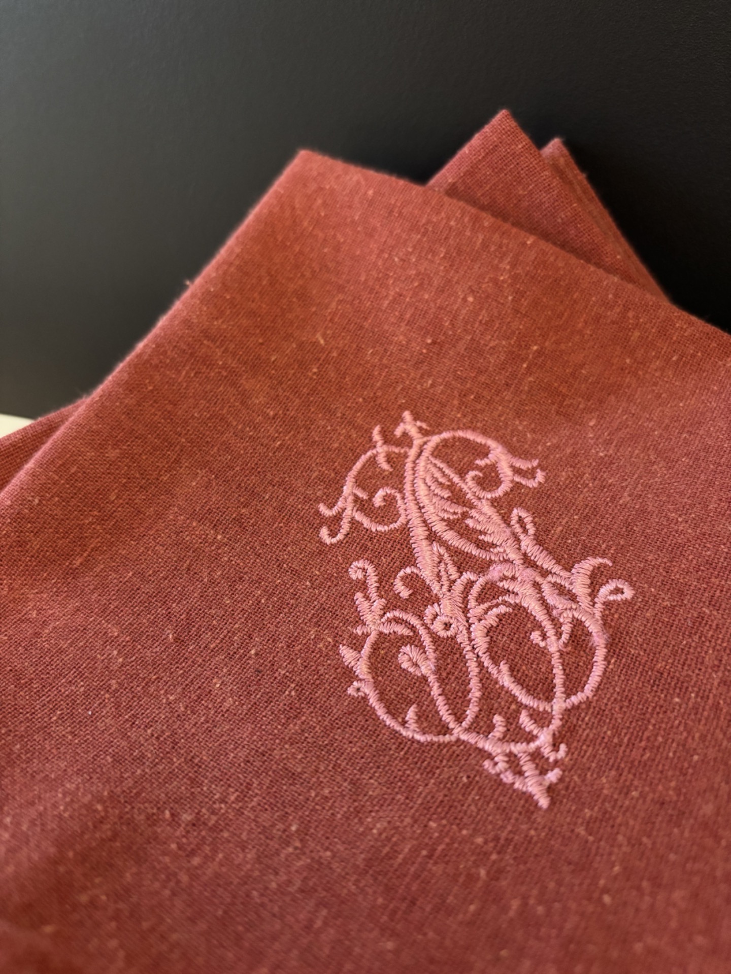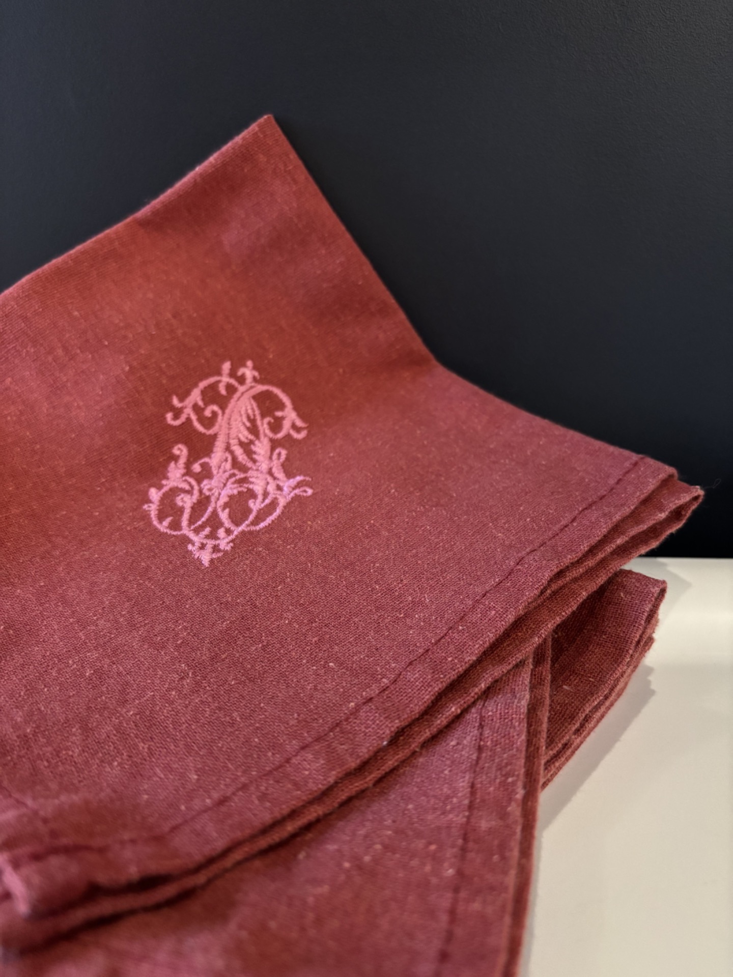 Lot de 6 serviettes anciennes en métis teinté dans un coloris peps "framboise écrasée", ornées d'un monogramme brodé en ton clair.