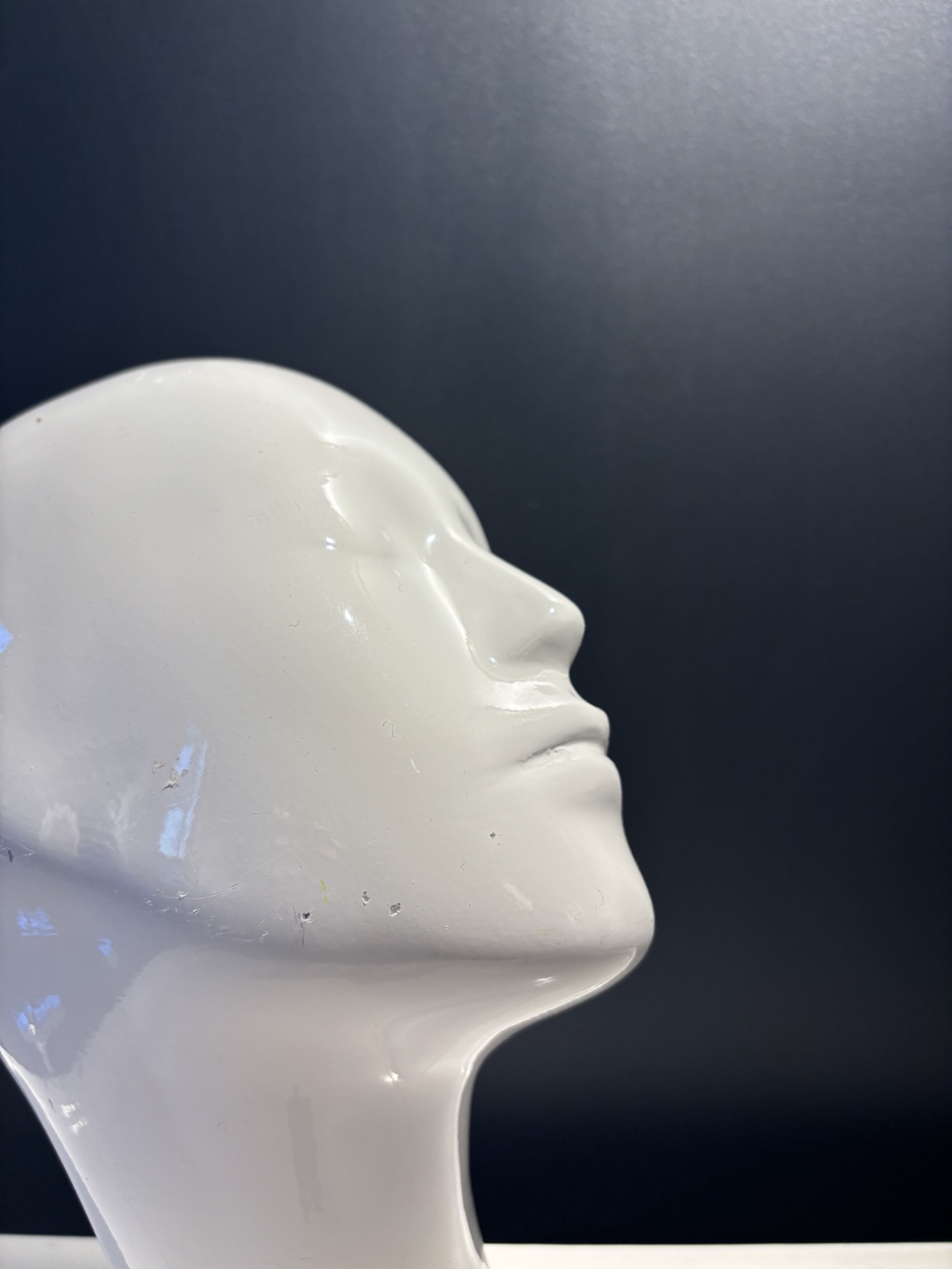 Son visage aux traits doux et son port de tête élancé lui donnent une présence forte, presque artistique. Le fini lisse et brillant capte la lumière et souligne ses lignes élégantes. Parfaite pour présenter un chapeau ou un foulard, elle s'impose aussi comme un véritable objet déco, à poser sur une console, une étagère ou dans une vitrine. Une pièce atypique, entre objet utilitaire et sculpture décorative.