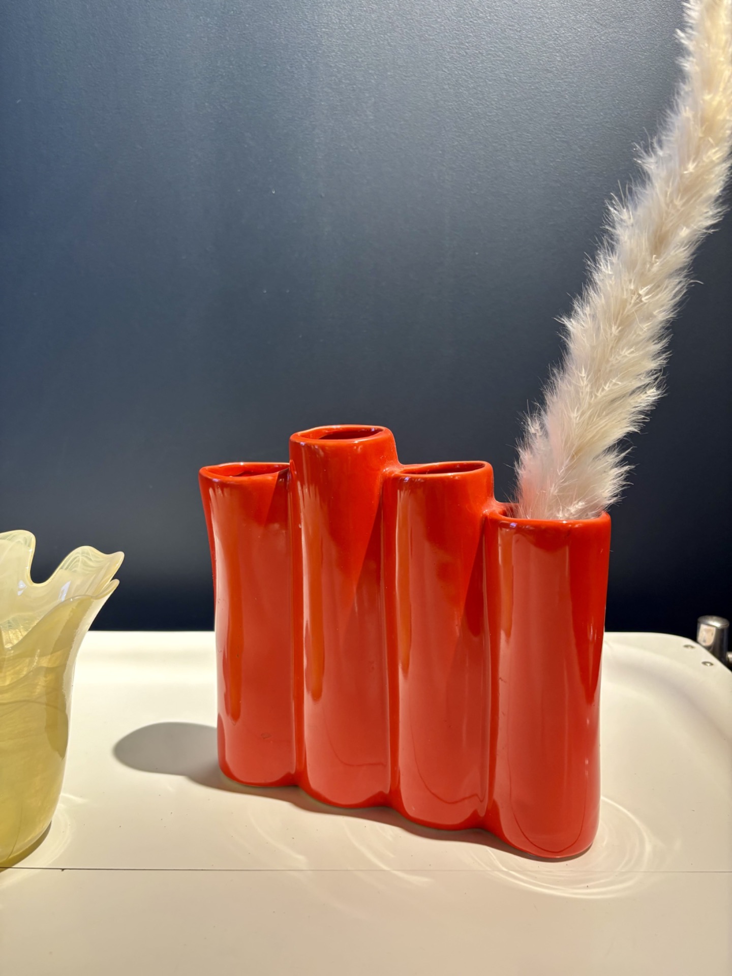 Son émaillage rouge vif capte immédiatement le regard et en fait une pièce forte, idéale pour réveiller un intérieur. À utiliser avec une tige unique, des fleurs séchées ou simplement posé comme objet sculptural, il trouve naturellement sa place sur une étagère, une console ou une table basse.